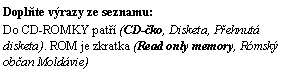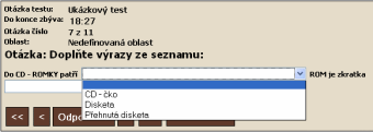 Je nutné vyplnit název otázky a přiřadit mu styl Nadpis 2;Otázka. V tomto typu testu se vypisuje seznam všech možných odpovědí v závorkách. Všechny tyto možnosti musí být odděleny čárkami a zároveň musí být napsány kurzívou. Např.: (CD-čko, Disketa, Přehnutá disketa). Text psaný tučným kurzívou je správná odpověď. K otázce lze libovolně přiložit obrázek. Ten musí mít formát GIF nebo JPG a musí být připojen k dokumentu s testem. |
