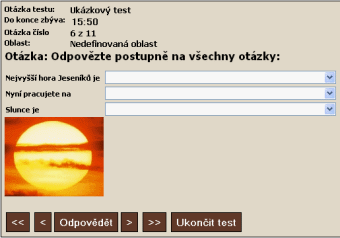 Je nutné vyplnit název otázky a přiřadit mu styl Nadpis 2;Otázka. V tomto typu testu se vypisuje seznam všech možných odpovědí v závorkách kurzívou. Tyto hodnoty vyplňuje student na internetu na pravé straně. Na levé se mu zobrazuje list se všemi možnostmi (údaje zadané před závorkou). Text psaný tučným písmem je správná odpověď. Pro zápis odpovědí se používá styl Seřazovačka. K otázce lze libovolně přiložit obrázek. Ten musí mít formát GIF nebo JPG a musí být připojen k dokumentu s testem. |